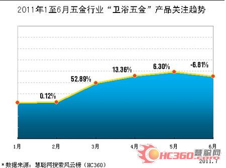 从慧聪搜索风云榜的数据分析,我们可以得出《2011年上半年“卫浴五金”产品关注趋势》报告,而从这份报告中,我们可以看出,卫浴五金总体关注度是比较高的,2月份的关注度比1月份环比增长了0.12%,3月份环比增长了52.89%,4月份比3月份环比增长了13.36%,5月份继续增长6.30%,到了6月份稍稍有所下降,而总体来说,与卫浴五金的市场形势是保持一致的。